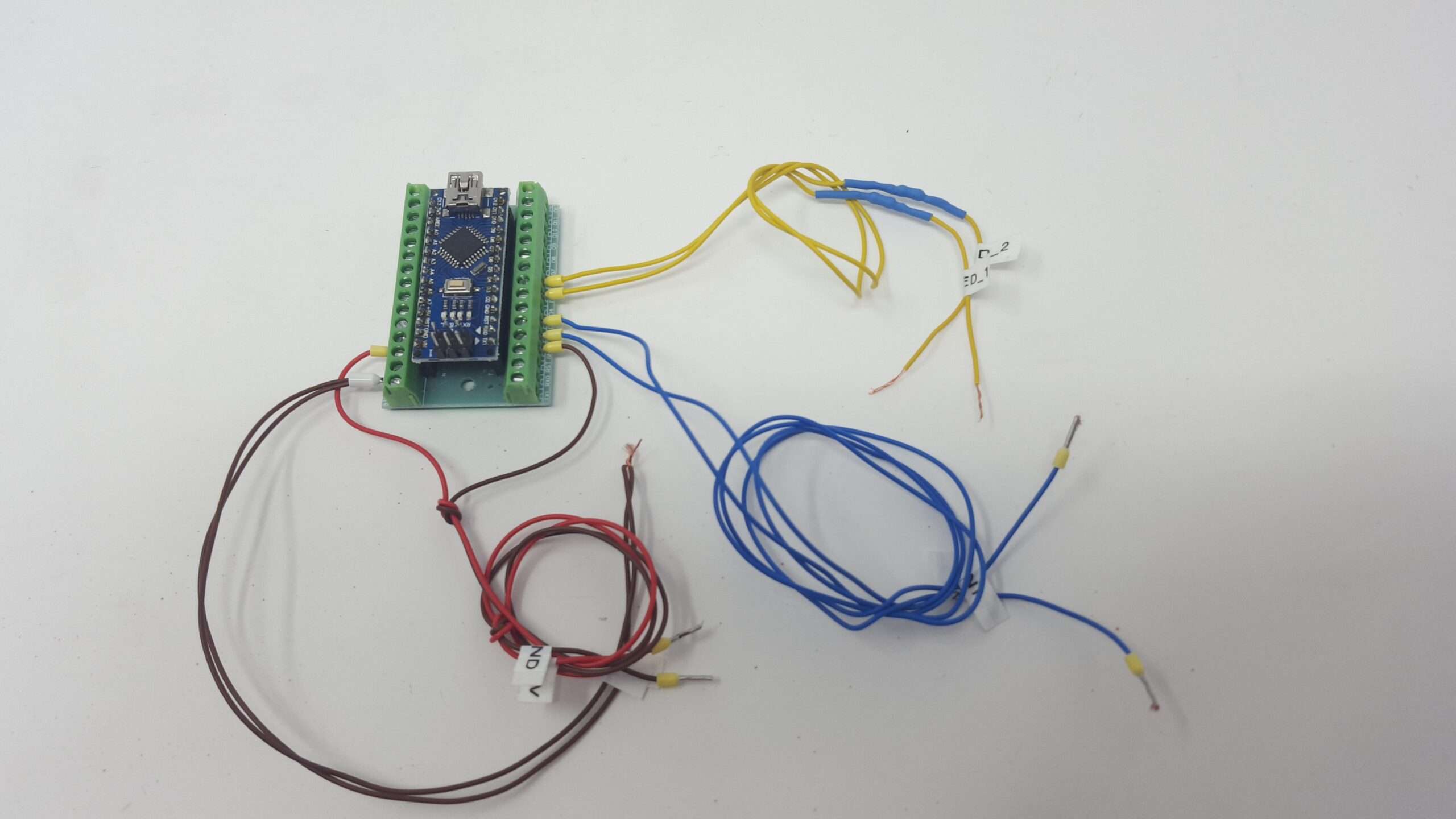 Die Lichtschranke besteht aus einer kleinen Leiterplatte, die durch zwei 2-polige Verbindungslitzen über Steckkontakte jeweils